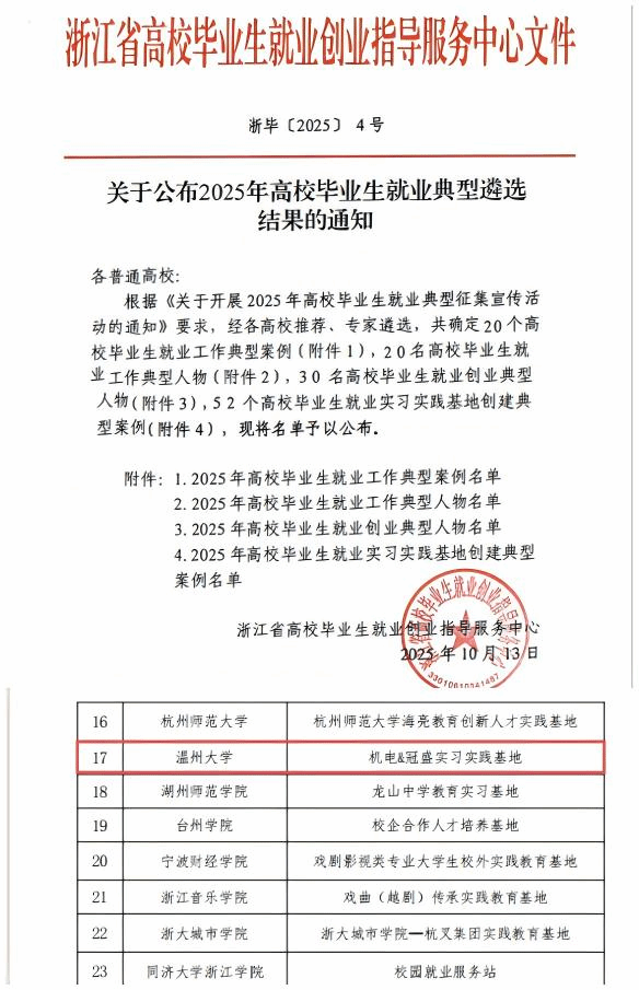 在近日公布的“2025年浙江省高校毕业生就业典型遴选结果的通知”中,双赢彩票 报送的“机电&冠盛实习实践基地”成功入选2025年高校毕业生就业实习实践基地创建典型案例,为双赢彩票 今年唯一获此荣誉的基地申报案例。