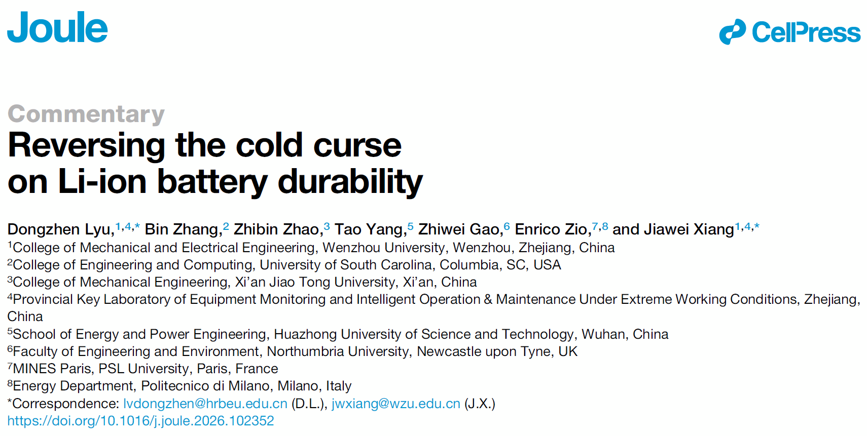 论文信息:Dongzhen Lyu, et al. Reversing the Cold Curse on Li-ion Battery Durability, Joule, 2026 //doi.org/10.1016/j.joule.2026.102352