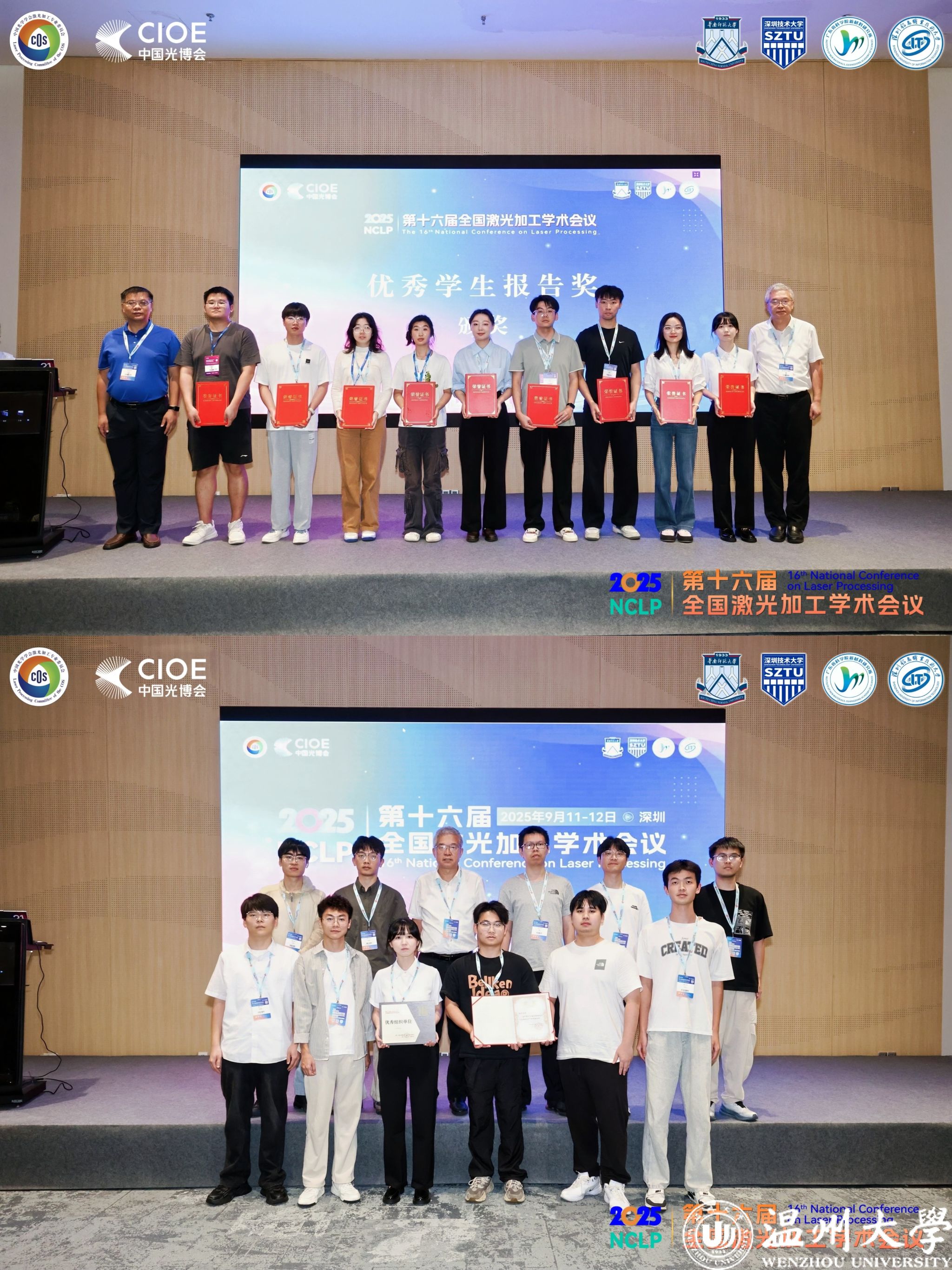 9 月 11 日,第十六届全国激光加工技术会议在深圳拉开帷幕。作为激光加工领域的重要学术交流平台,本次会议汇聚行业智慧,双赢彩票 冯爱新教授带领11名研究生参会,以扎实的科研积累与专业表现亮相会场。会议期间,双赢彩票 因组织工作成效突出获评“优秀组织单位”,研究生金欢欢等人凭借精彩的学术报告斩获“优秀学生报告奖”,实现集体与个人荣誉双丰收。